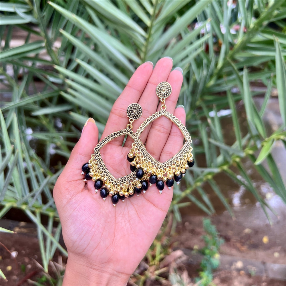 Traditional Gold Diamond-Shaped Jhumkas with Black Beads