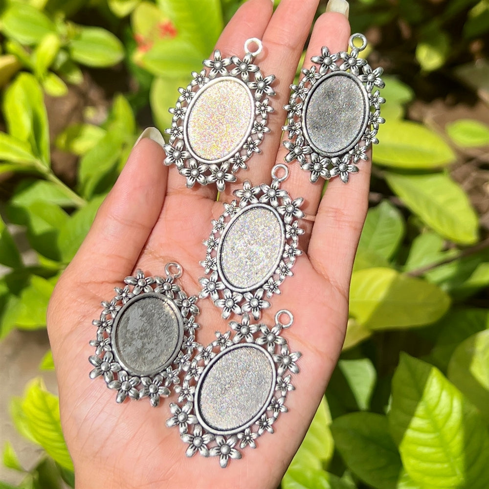 Vintage Floral Silver Oval Pendant Base (Set of 5)